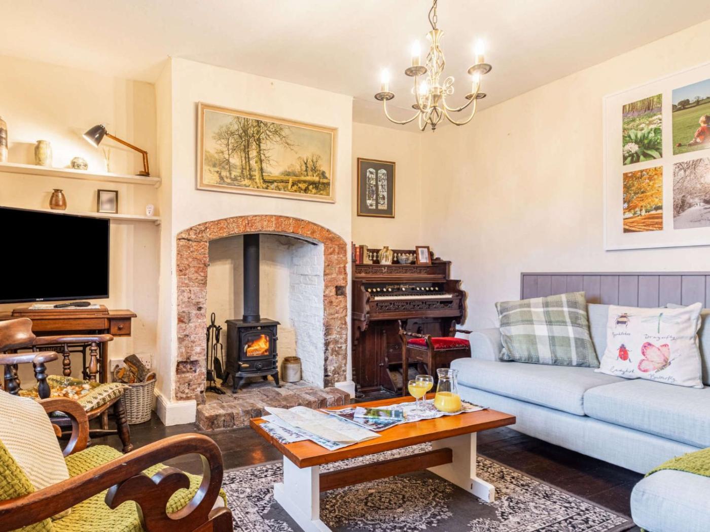 Three-Bedroom House. This holiday home features a fireplace. The holiday home features 3 bedrooms, 2 bathrooms and a kitchen. Guests can make meals in the kitchen that comes with a refrigerator, a dishwasher, kitchenware and an oven. The holiday home provides a washing machine, a high chair for children, heating, a TV, as well as garden views. The unit offers 4 beds.